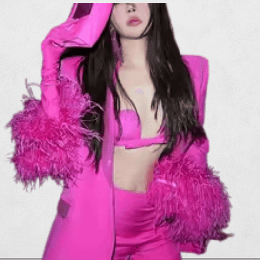 Bold Pink Glam Set Description: Step into the spotlight with this vibrant feather-trimmed two-piece. Designed for confidence, power, and fierce femininity. Perfect for standout moments.